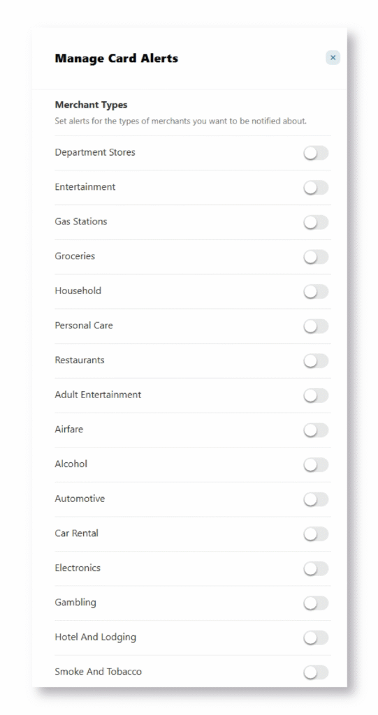 Merchant‑type alerts notify you whenever a transaction occurs at certain types of businesses, such as restaurants, gas stations, online retailers, or travel services.